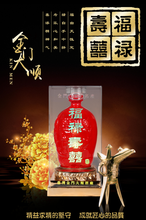 金門大順酒廠,座落于金門北緯24.5度,地處海隅,濱大陸,得天獨厚的地理,使它擁有絕佳的水質、空氣、氣候及原料的四大天然釀酒條件。金門大順酒廠的高粱酒釀造是利用金門特產『旱地高粱』、引用當地水質甘甜的泉水、金門潔凈的空氣與氣候條件,并承襲傳統古法之釀酒技術,加上獨家的釀酒專業技術經驗【三離二鍋一翻】的發酵釀酒工藝,經掐頭去尾后入庫,去蕪存菁。而造就出金門大順酒廠的高粱酒特色「清澈透明、質地純凈、芳香濃郁」之一系列高粱酒。金門大順酒廠制酒承襲著金門得天獨厚的地理環境,加上三代流傳之古法醇釀技技術,結合經驗與現代化生產,釀出風味獨特,香、醇、甘、冽的【臺島】【臺金爽】【牛樟芝高粱酒】【龍騰鳳舞】【紅雙十】【陳高吶】【臺灣小酒】等多樣系列產品。真實原味、清香散發,甘冽醇厚的絕佳風味。